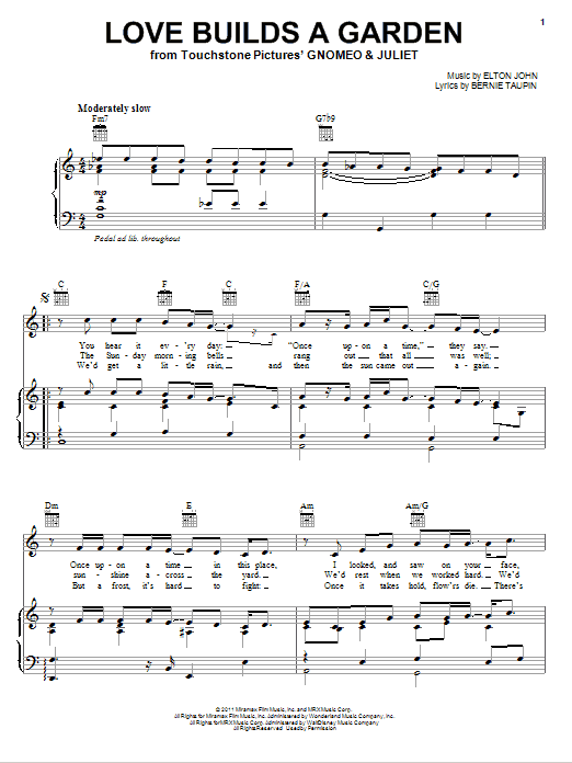 Download or print Elton John Love Builds A Garden sheet music, chords and digital score arranged for Piano, Vocal & Guitar Chords (Right-Hand Melody). This Film/TV score includes 5 page(s).