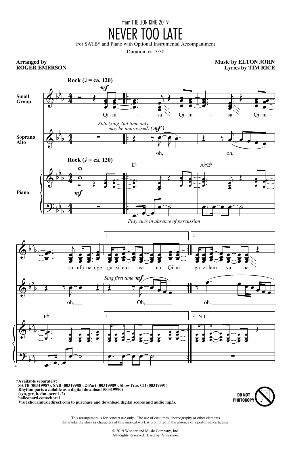 Download or print Elton John Never Too Late (from The Lion King 2019) (arr. Roger Emerson) sheet music, chords and digital score arranged for SAB Choir. This Disney score includes 15 page(s).