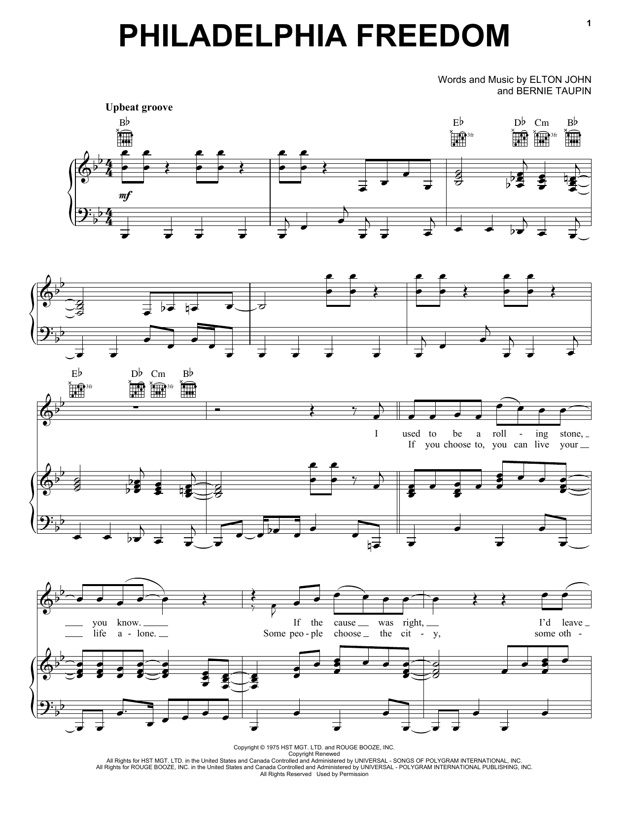 Download or print Elton John Philadelphia Freedom sheet music, chords and digital score arranged for Piano, Vocal & Guitar Chords (Right-Hand Melody). This Patriotic score includes 7 page(s).