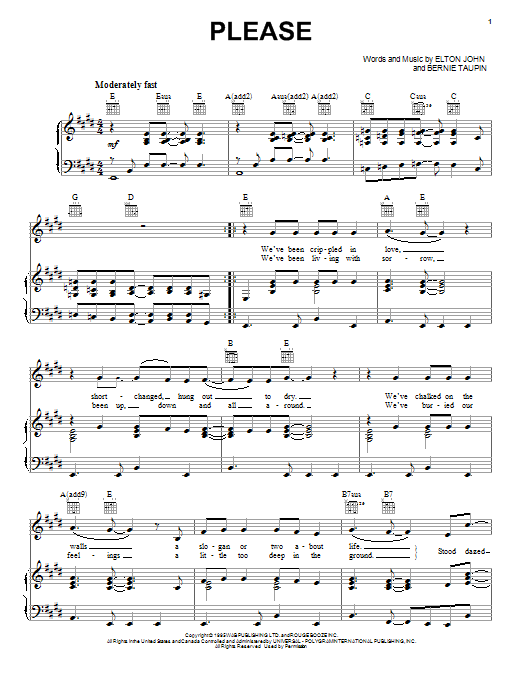 Download or print Elton John Please sheet music, chords and digital score arranged for Piano, Vocal & Guitar Chords (Right-Hand Melody). This Love score includes 5 page(s).