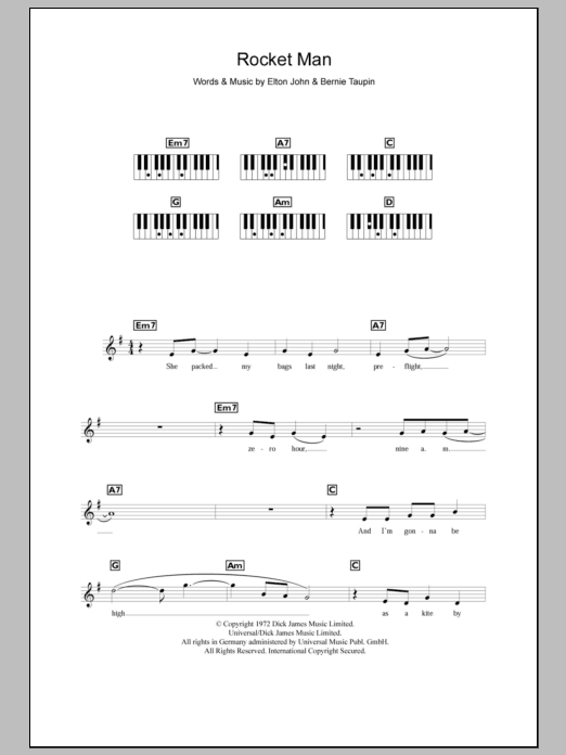 Download or print Elton John Rocket Man sheet music, chords and digital score arranged for Lead Sheet / Fake Book. This Pop score includes 3 page(s).