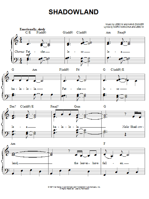 Download or print Lebo M., Hans Zimmer and Mark Mancina Shadowland (from The Lion King: Broadway Musical) sheet music, chords and digital score arranged for Easy Piano. This Disney score includes 6 page(s).
