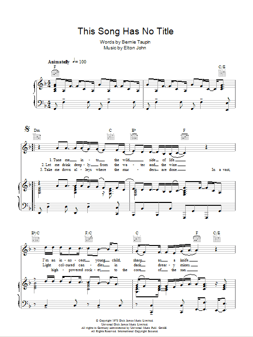 Download or print Elton John This Song Has No Title sheet music, chords and digital score arranged for Piano, Vocal & Guitar Chords. This Pop score includes 7 page(s).