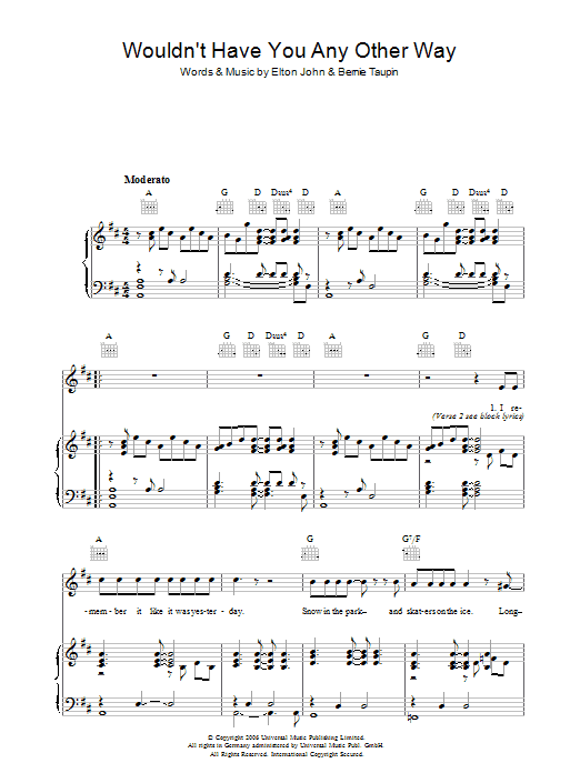 Download or print Elton John Wouldn't Have You Any Other Way (NYC) sheet music, chords and digital score arranged for Piano, Vocal & Guitar Chords (Right-Hand Melody). This Pop score includes 8 page(s).