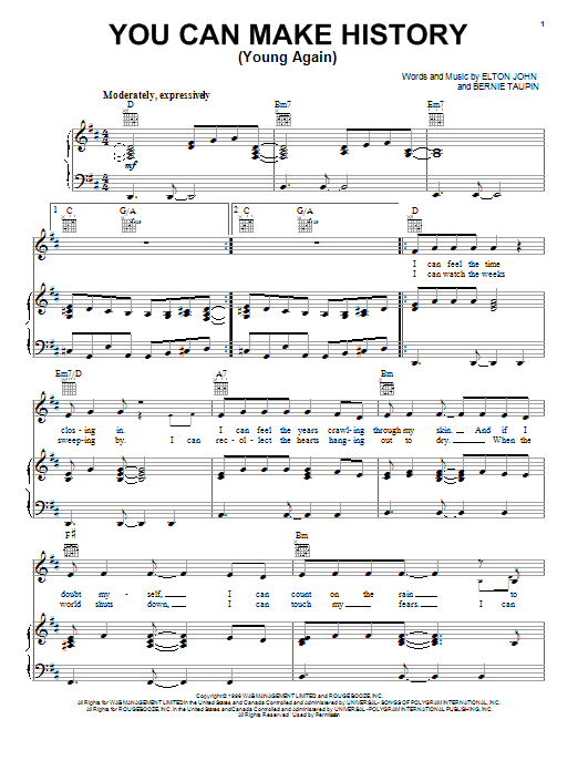 Download or print Elton John You Can Make History (Young Again) sheet music, chords and digital score arranged for Piano, Vocal & Guitar Chords (Right-Hand Melody). This Pop score includes 5 page(s).