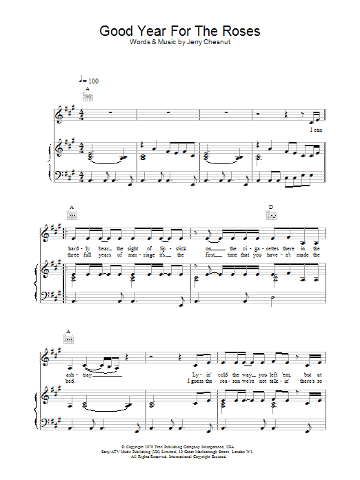 Download or print Elvis Costello A Good Year For The Roses sheet music, chords and digital score arranged for Piano, Vocal & Guitar Chords. This Pop score includes 4 page(s).
