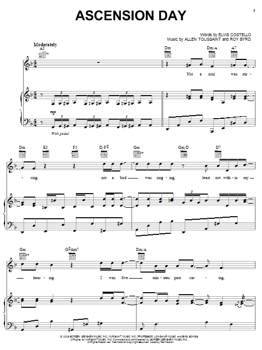 Download or print Elvis Costello & Allen Toussaint Ascension Day sheet music, chords and digital score arranged for Piano, Vocal & Guitar Chords (Right-Hand Melody). This Pop score includes 8 page(s).