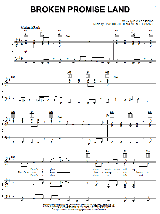 Download or print Elvis Costello & Allen Toussaint Broken Promise Land sheet music, chords and digital score arranged for Piano, Vocal & Guitar Chords (Right-Hand Melody). This Pop score includes 5 page(s).