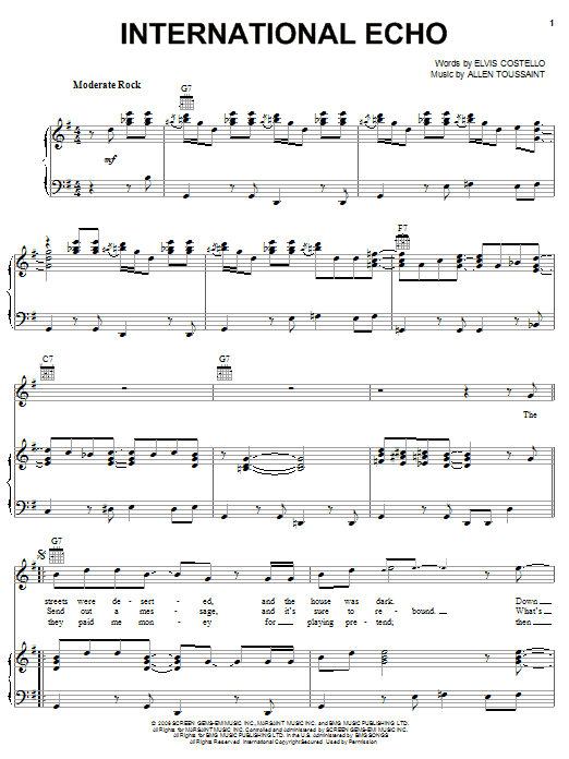Download or print Elvis Costello & Allen Toussaint International Echo sheet music, chords and digital score arranged for Piano, Vocal & Guitar Chords (Right-Hand Melody). This Pop score includes 7 page(s).
