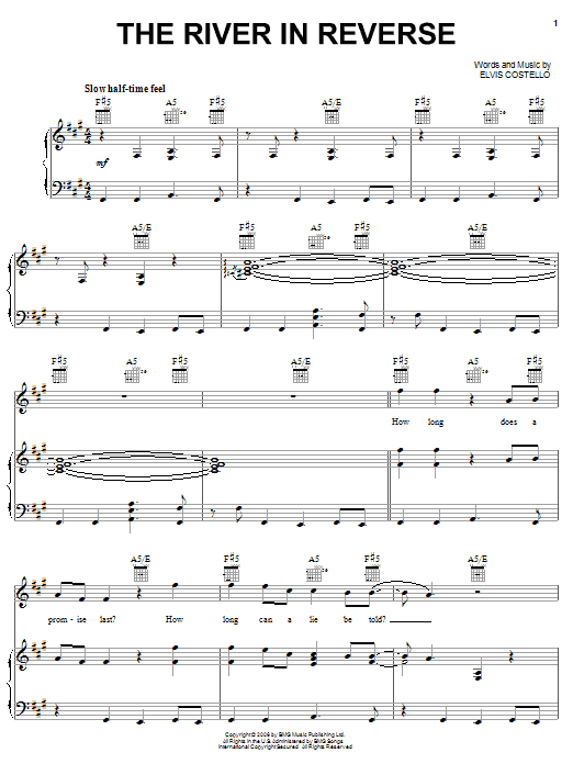 Download or print Elvis Costello & Allen Toussaint The River In Reverse sheet music, chords and digital score arranged for Piano, Vocal & Guitar Chords (Right-Hand Melody). This Pop score includes 8 page(s).