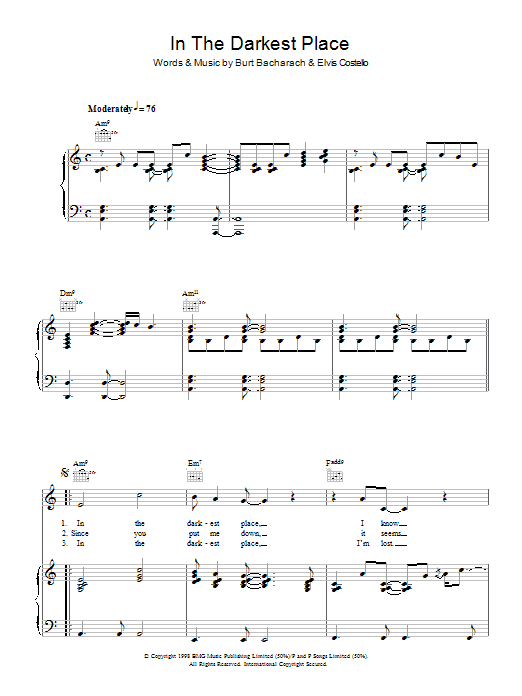 Download or print Elvis Costello & Burt Bacharach In The Darkest Place sheet music, chords and digital score arranged for Piano, Vocal & Guitar Chords. This Pop score includes 7 page(s).