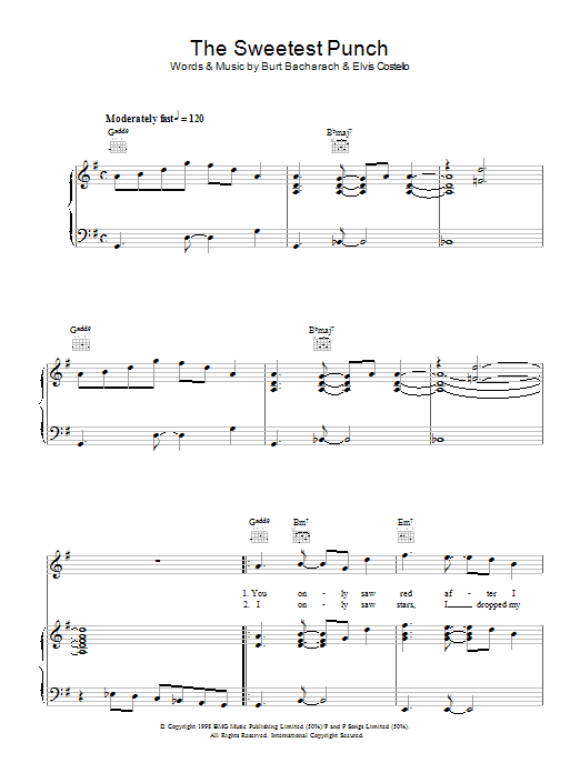 Download or print Elvis Costello & Burt Bacharach The Sweetest Punch sheet music, chords and digital score arranged for Piano, Vocal & Guitar Chords. This Pop score includes 7 page(s).