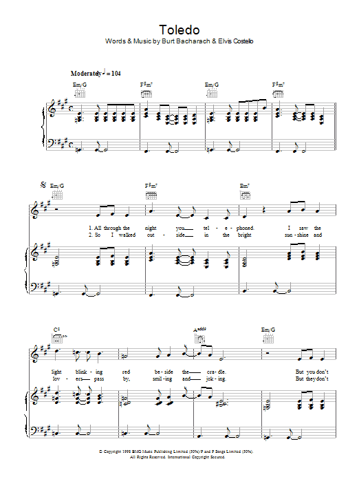 Download or print Elvis Costello & Burt Bacharach Toledo sheet music, chords and digital score arranged for Piano, Vocal & Guitar Chords. This Pop score includes 6 page(s).