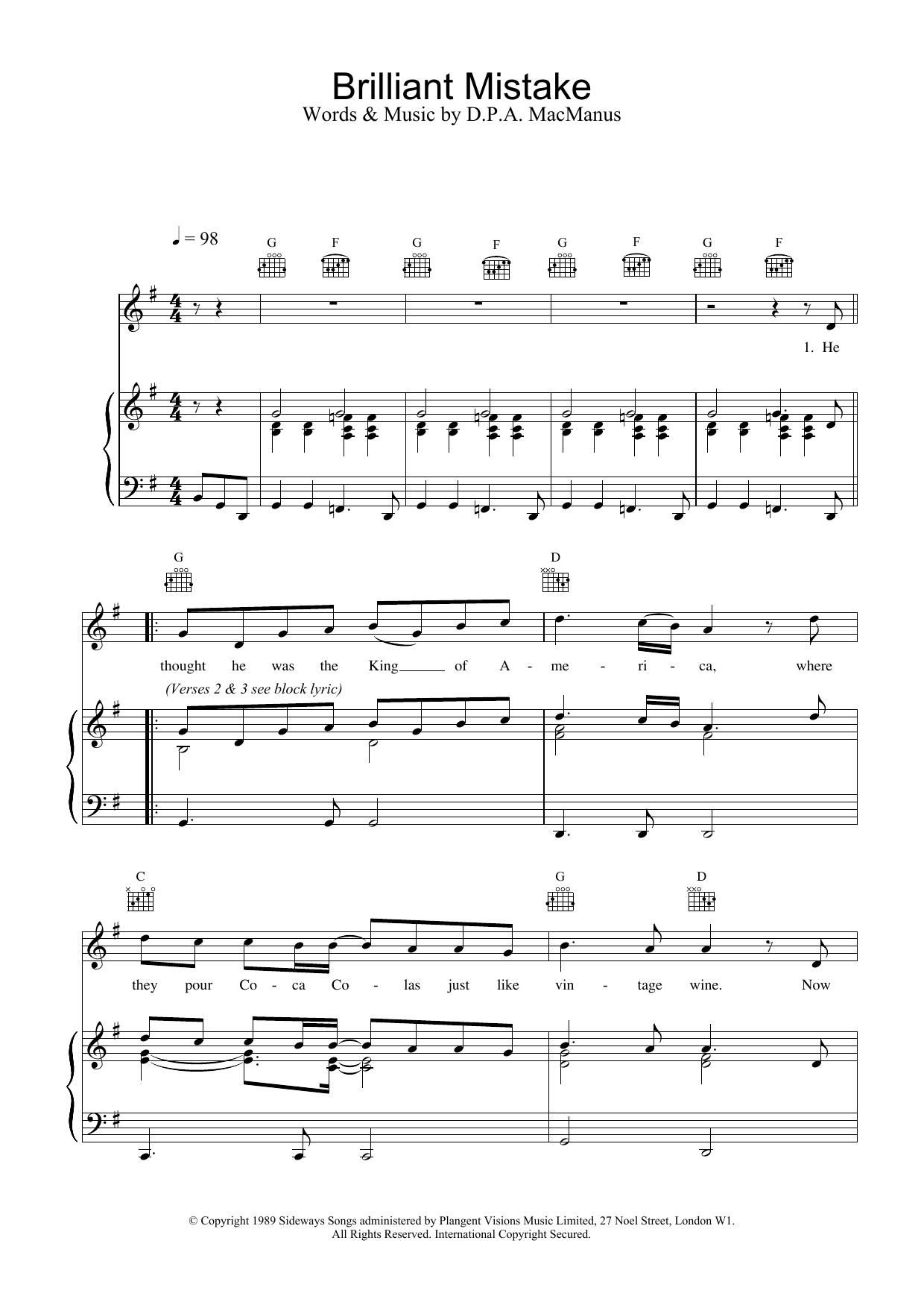 Download or print Elvis Costello Brilliant Mistake sheet music, chords and digital score arranged for Piano, Vocal & Guitar Chords. This Pop score includes 4 page(s).