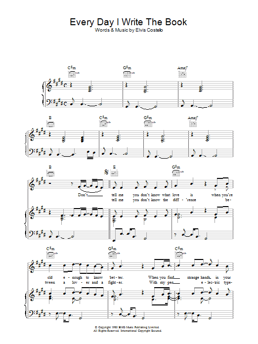 Download or print Elvis Costello Every Day I Write The Book sheet music, chords and digital score arranged for Piano, Vocal & Guitar Chords. This Pop score includes 4 page(s).