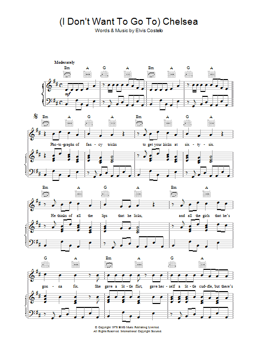 Download or print Elvis Costello (I Don't Want To) Go To Chelsea sheet music, chords and digital score arranged for Piano, Vocal & Guitar Chords. This Pop score includes 5 page(s).