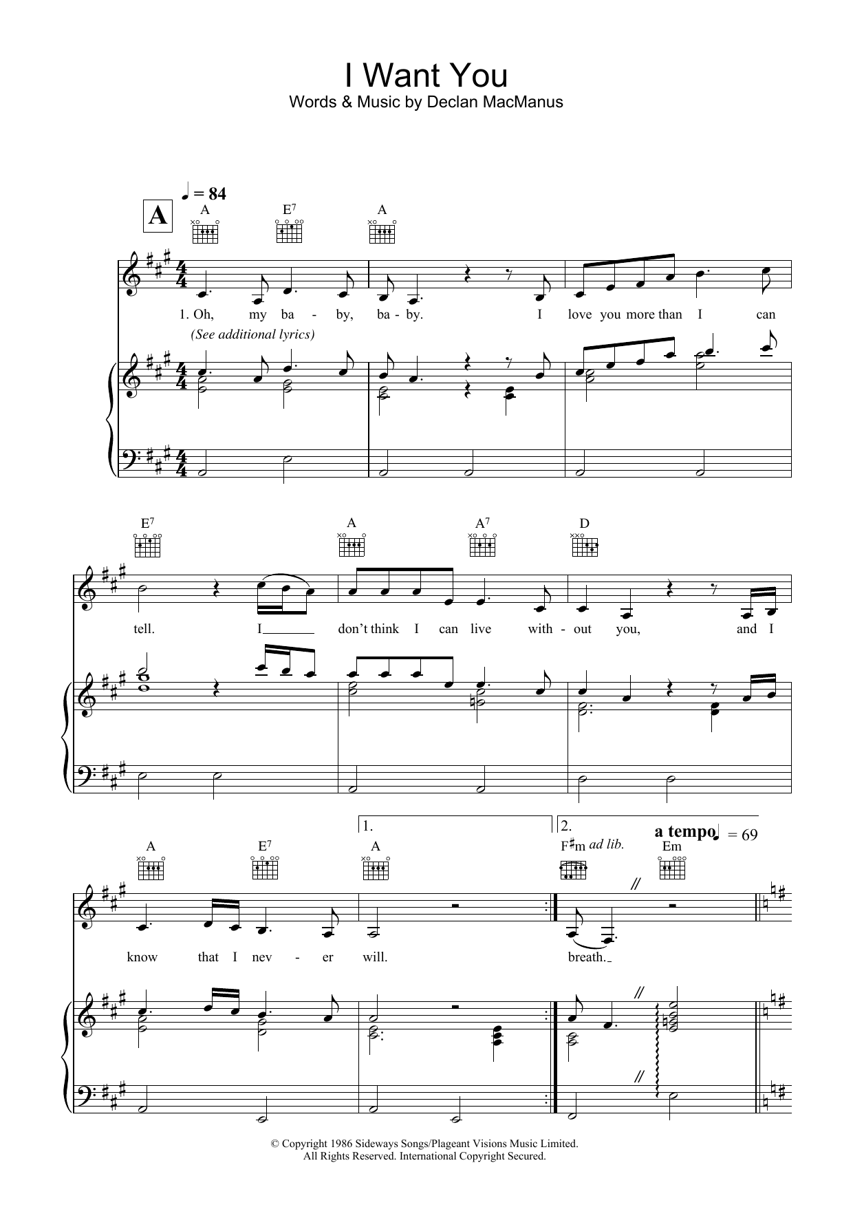 Download or print Elvis Costello I Want You sheet music, chords and digital score arranged for Piano, Vocal & Guitar Chords. This Pop score includes 7 page(s).