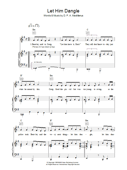 Download or print Elvis Costello Let Him Dangle sheet music, chords and digital score arranged for Piano, Vocal & Guitar Chords. This Pop score includes 4 page(s).