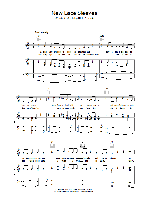 Download or print Elvis Costello New Lace Sleeves sheet music, chords and digital score arranged for Piano, Vocal & Guitar Chords. This Pop score includes 4 page(s).