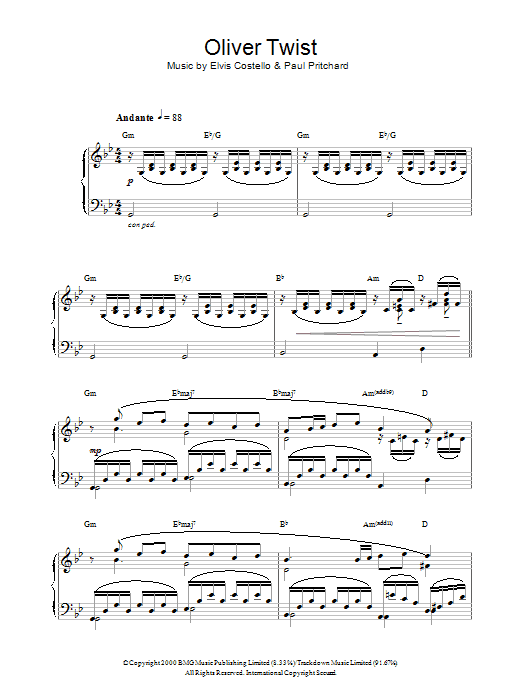 Download or print Elvis Costello Oliver Twist sheet music, chords and digital score arranged for Piano Solo. This Film/TV score includes 3 page(s).