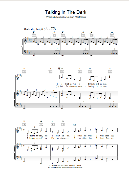 Download or print Elvis Costello Talking In The Dark sheet music, chords and digital score arranged for Piano, Vocal & Guitar Chords. This Pop score includes 4 page(s).
