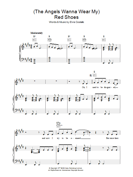 Download or print Elvis Costello (The Angels Wanna Wear My) Red Shoes sheet music, chords and digital score arranged for Piano, Vocal & Guitar Chords. This Pop score includes 6 page(s).