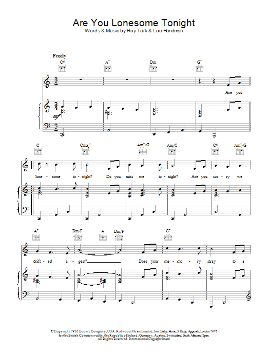 Download or print Elvis Presley Are You Lonesome Tonight sheet music, chords and digital score arranged for Piano, Vocal & Guitar Chords. This Rock score includes 2 page(s).