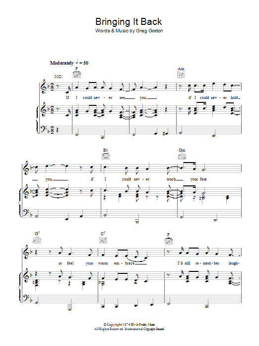 Download or print Elvis Presley Bringing It Back sheet music, chords and digital score arranged for Piano, Vocal & Guitar Chords. This Rock score includes 5 page(s).