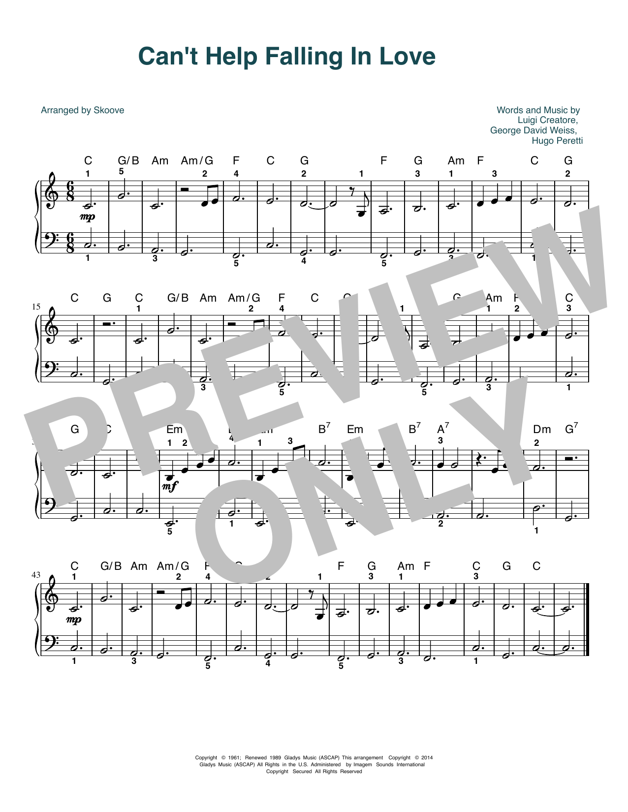 Download or print Elvis Presley Can't Help Falling In Love (arr. Skoove) sheet music, chords and digital score arranged for Easy Piano. This Pop score includes 1 page(s).