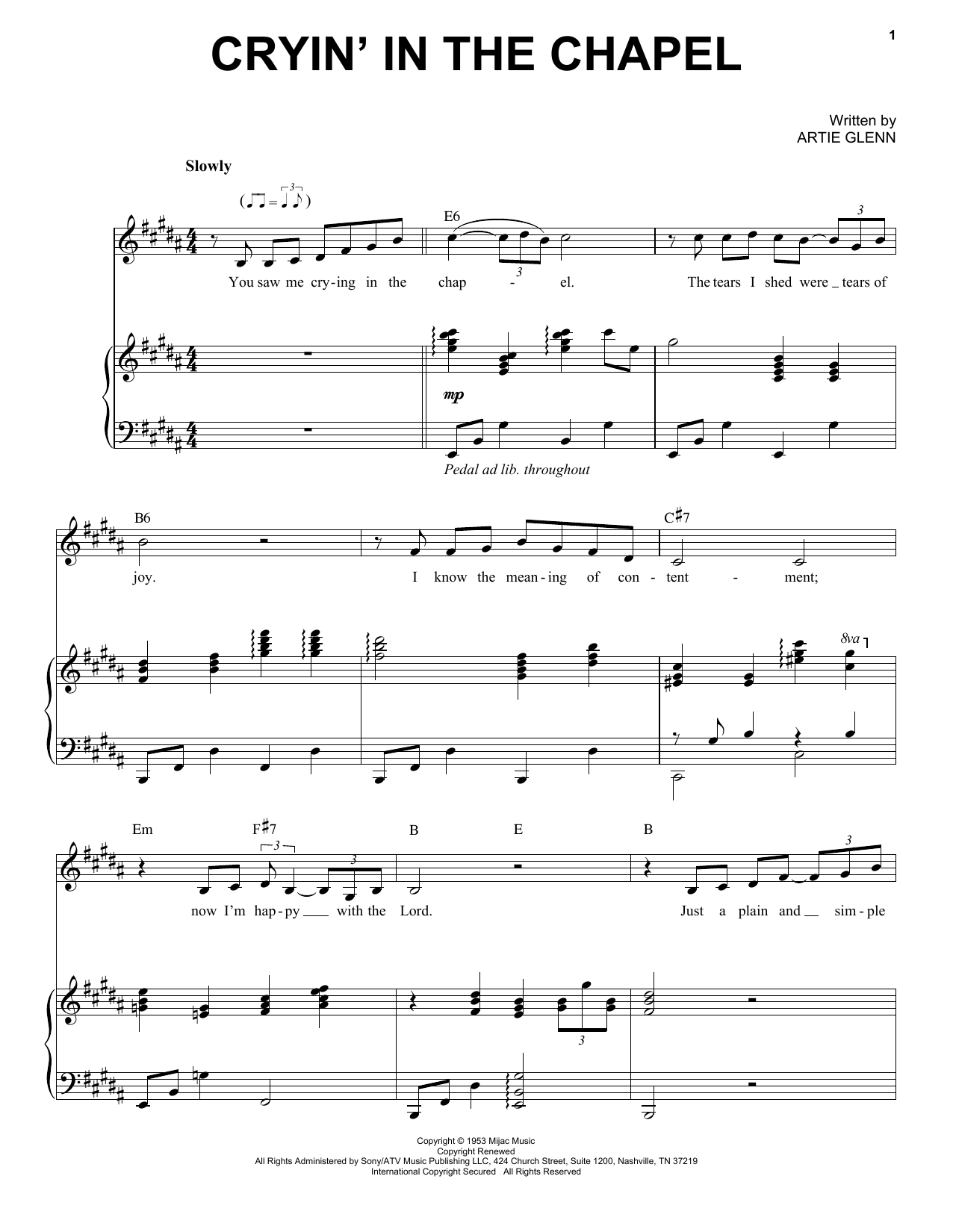 Download or print Elvis Presley Cryin' In The Chapel sheet music, chords and digital score arranged for Lead Sheet / Fake Book. This Pop score includes 1 page(s).