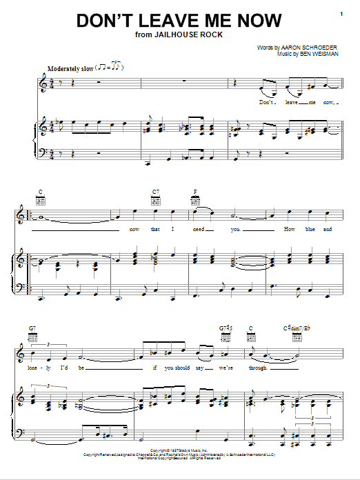 Download or print Elvis Presley Don't Leave Me Now sheet music, chords and digital score arranged for Piano, Vocal & Guitar Chords (Right-Hand Melody). This Pop score includes 3 page(s).