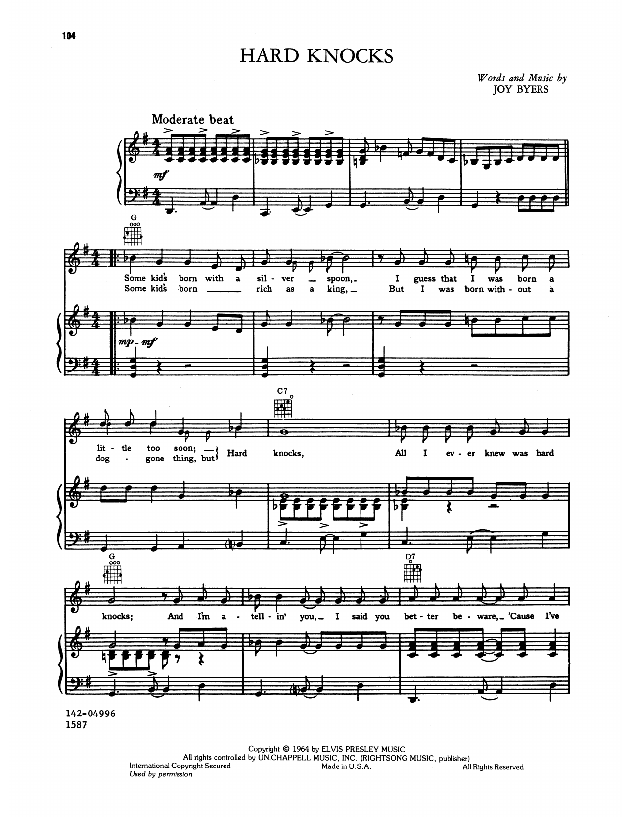 Download or print Elvis Presley Hard Knocks sheet music, chords and digital score arranged for Piano, Vocal & Guitar Chords (Right-Hand Melody). This Pop score includes 3 page(s).
