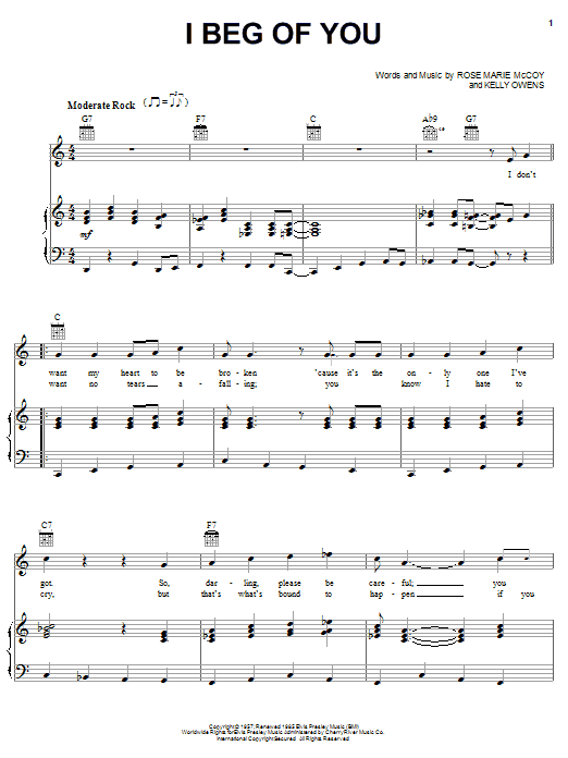 Download or print Elvis Presley I Beg Of You sheet music, chords and digital score arranged for Piano, Vocal & Guitar Chords (Right-Hand Melody). This Country score includes 3 page(s).