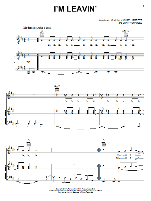 Download or print Elvis Presley I'm Leavin' sheet music, chords and digital score arranged for Piano, Vocal & Guitar Chords (Right-Hand Melody). This Country score includes 4 page(s).