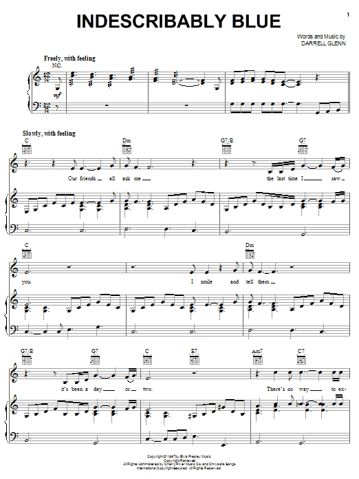 Download or print Elvis Presley Indescribably Blue sheet music, chords and digital score arranged for Piano, Vocal & Guitar Chords (Right-Hand Melody). This Blues score includes 4 page(s).