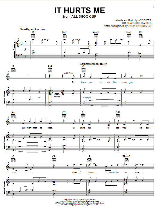 Download or print Elvis Presley It Hurts Me sheet music, chords and digital score arranged for Piano, Vocal & Guitar Chords (Right-Hand Melody). This Musical/Show score includes 5 page(s).