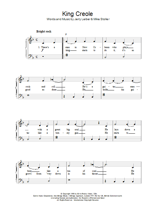 Download or print Elvis Presley King Creole sheet music, chords and digital score arranged for Piano, Vocal & Guitar Chords (Right-Hand Melody). This Pop score includes 3 page(s).