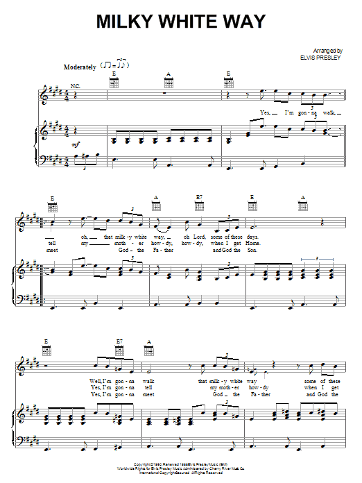 Download or print Elvis Presley Milky White Way sheet music, chords and digital score arranged for Piano, Vocal & Guitar Chords (Right-Hand Melody). This Christian score includes 2 page(s).
