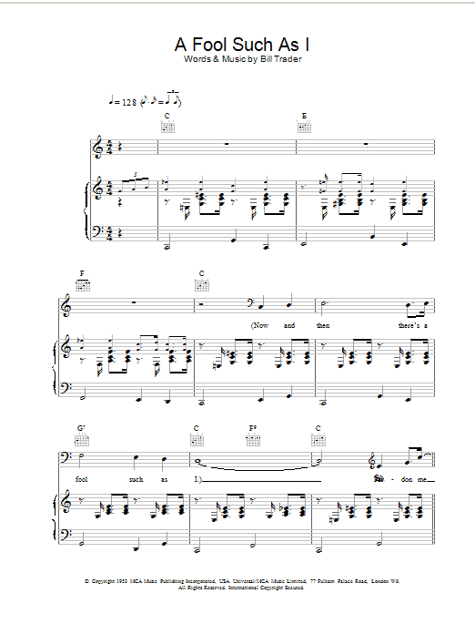 Download or print Elvis Presley (Now And Then There's) A Fool Such As I sheet music, chords and digital score arranged for Piano, Vocal & Guitar Chords. This Rock score includes 4 page(s).