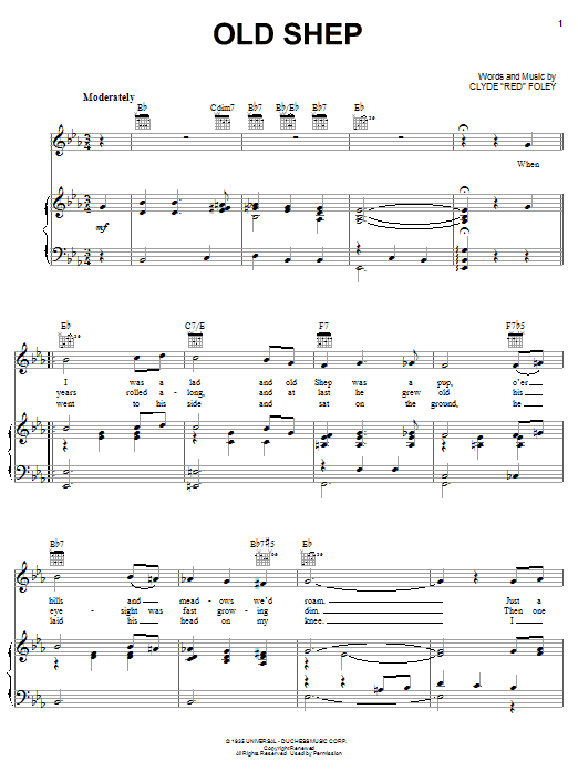 Download or print Elvis Presley Old Shep sheet music, chords and digital score arranged for Piano, Vocal & Guitar Chords (Right-Hand Melody). This Country score includes 4 page(s).