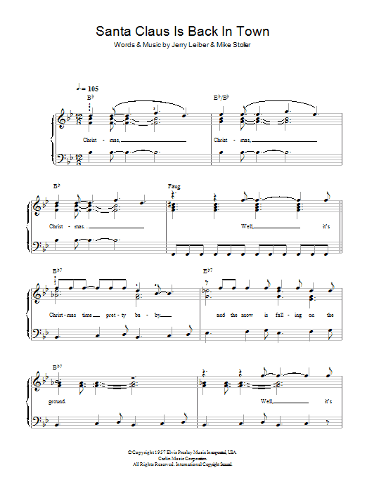 Download or print Elvis Presley Santa Claus Is Back In Town sheet music, chords and digital score arranged for Easy Piano. This Christmas score includes 3 page(s).