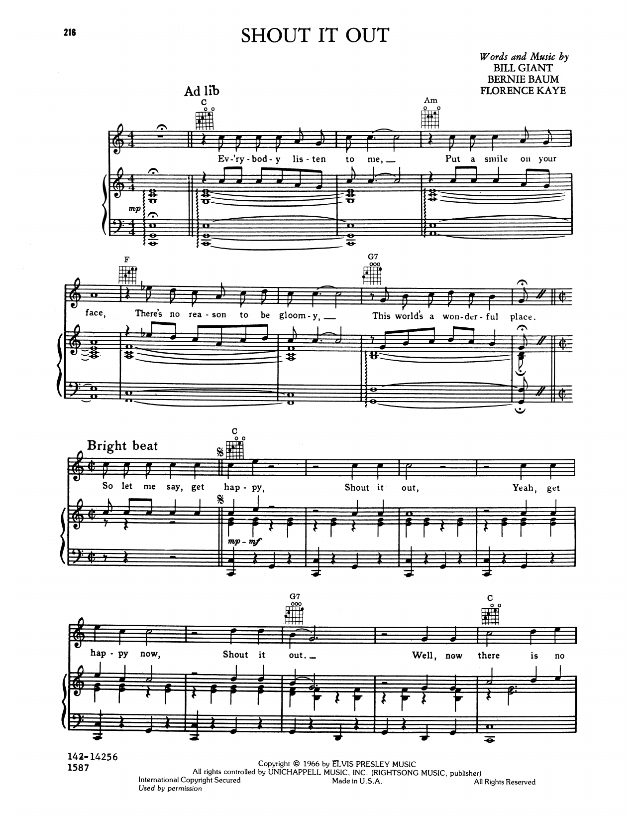 Download or print Elvis Presley Shout It Out sheet music, chords and digital score arranged for Piano, Vocal & Guitar Chords (Right-Hand Melody). This Pop score includes 2 page(s).