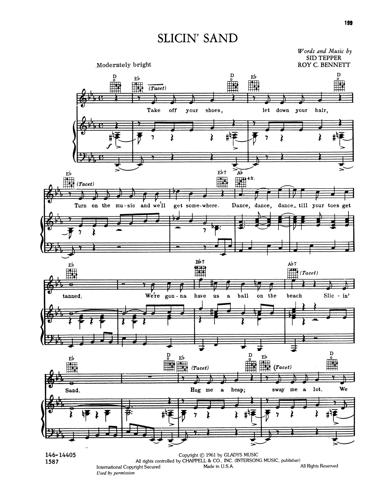 Download or print Elvis Presley Slicin' Sand sheet music, chords and digital score arranged for Piano, Vocal & Guitar Chords (Right-Hand Melody). This Pop score includes 3 page(s).