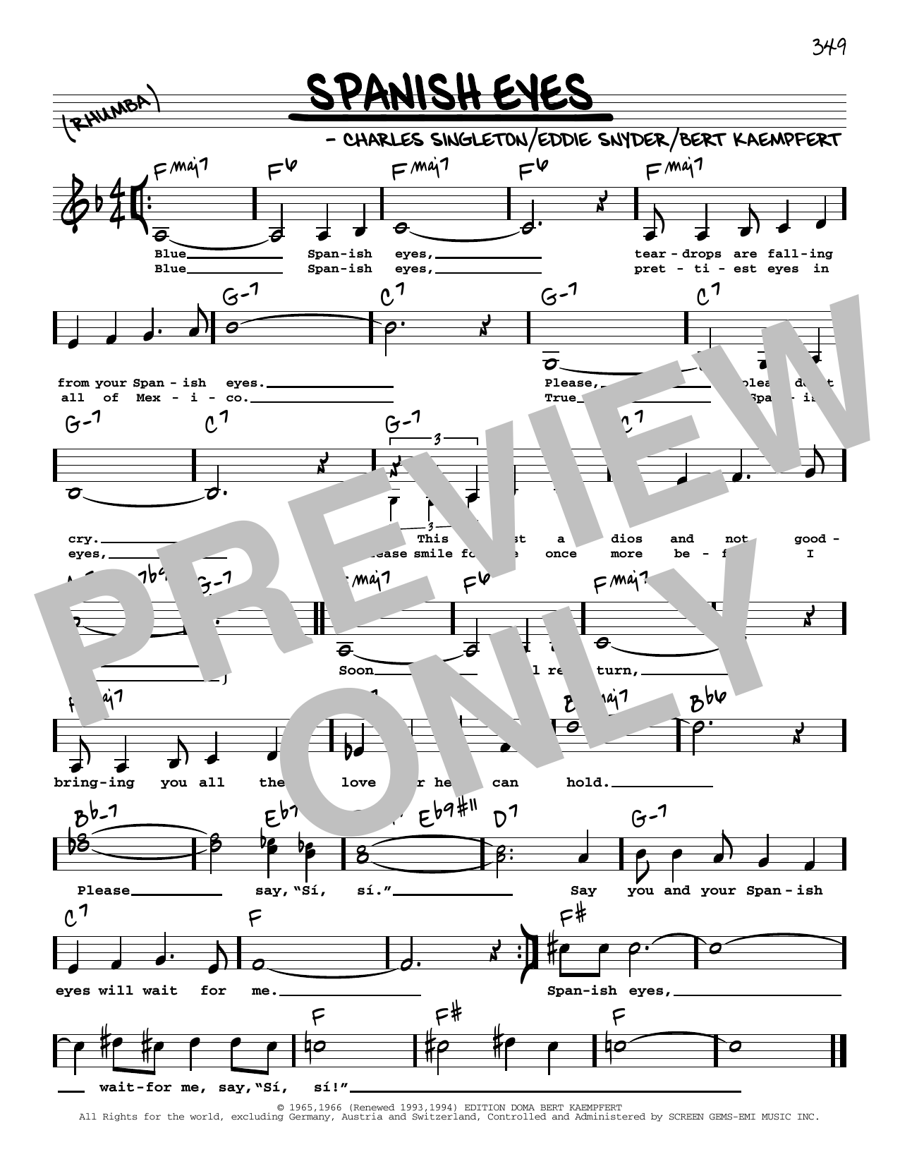Download or print Elvis Presley Spanish Eyes (Low Voice) sheet music, chords and digital score arranged for Real Book – Melody, Lyrics & Chords. This Jazz score includes 1 page(s).