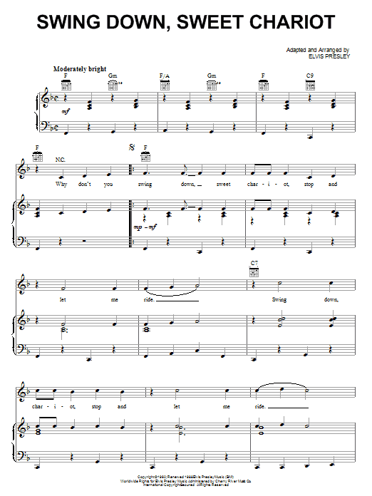 Download or print Elvis Presley Swing Down, Sweet Chariot sheet music, chords and digital score arranged for Piano, Vocal & Guitar Chords (Right-Hand Melody). This Christian score includes 6 page(s).