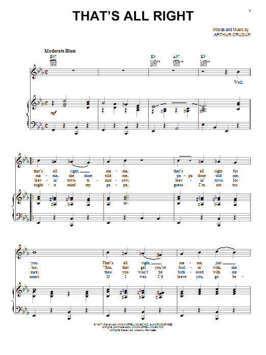 Download or print Elvis Presley That's All Right sheet music, chords and digital score arranged for Piano, Vocal & Guitar Chords. This Pop score includes 2 page(s).
