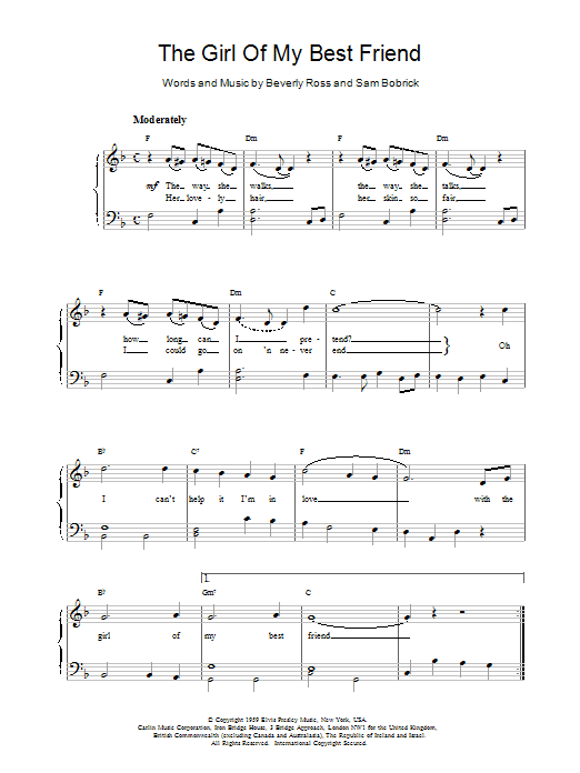 Download or print Elvis Presley The Girl Of My Best Friend sheet music, chords and digital score arranged for Easy Piano. This Rock score includes 3 page(s).