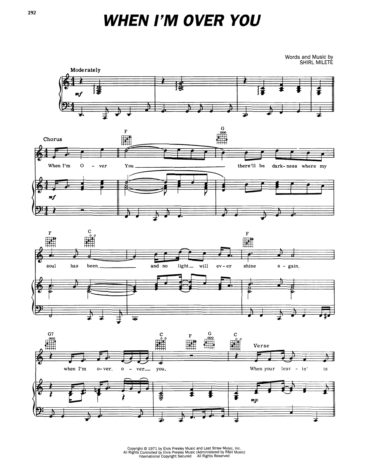 Download or print Elvis Presley When I'm Over You sheet music, chords and digital score arranged for Piano, Vocal & Guitar Chords (Right-Hand Melody). This Pop score includes 2 page(s).