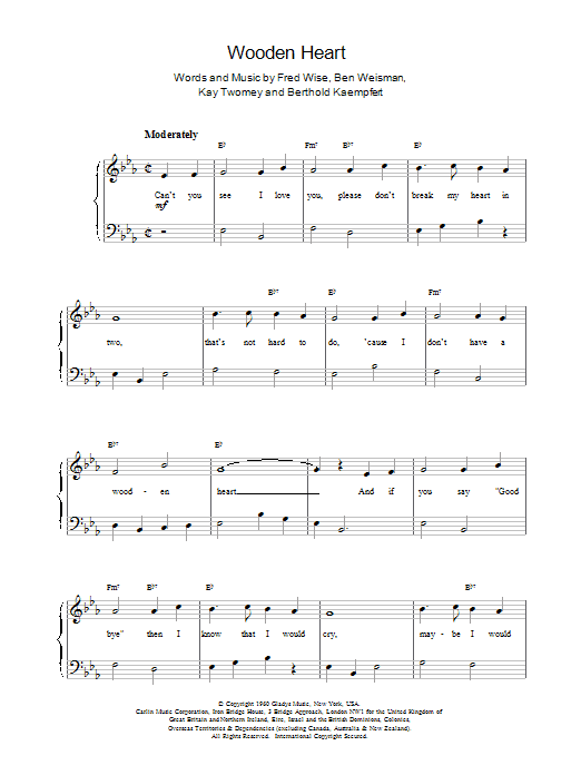 Download or print Elvis Presley Wooden Heart sheet music, chords and digital score arranged for Piano Chords/Lyrics. This Rock score includes 2 page(s).