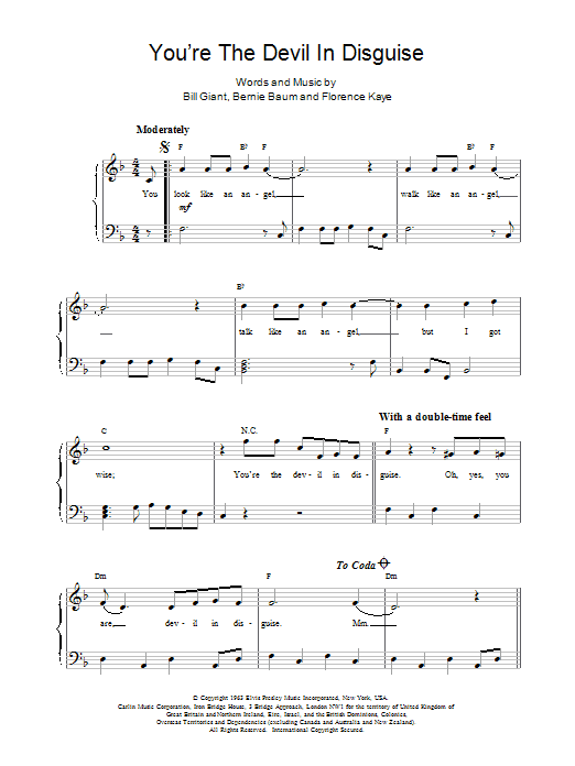 Download or print Elvis Presley (You're The) Devil In Disguise sheet music, chords and digital score arranged for Piano & Vocal. This Pop score includes 4 page(s).